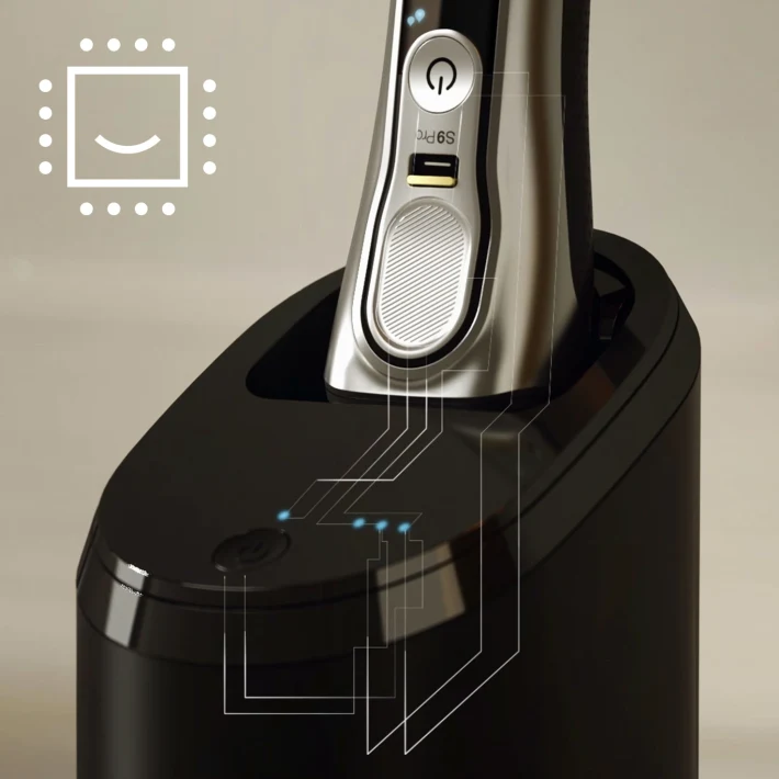 Aktives Trocknen und Aufladen: Der Rasierer ist in 45 Minuten vollständig getrocknet, in einer Stunde vollständig aufgeladen und kann durch Schnellladung in 5 Minuten für eine einzige Rasur ausreichend aufgeladen werden.