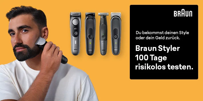 ²Aktionszeitraum (Datum des Kaufbeleges): 01.02.2026 – 28.02.2026. Einlösezeitraum: 01.02.2026 – 15.03.2026. 50 € Cashback auf IPL7 & IPL 5, 40 € Cashback auf Series 9 & Series 8 Rasierer, 25 € Cashback auf Silk-épil 9 Flex, 20 € Cashback auf Silk-épil 9 & Series 7 Rasierer, 15 € Cashback auf All-in-One 7 & Barttrimmer 9. Mehr Informationen zu den teilnehmenden Produkten und zum Ablauf der Cashback-Aktion auf https://www.for-me-online.de/braun-portfolio-cashback