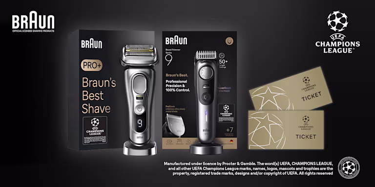 ¹ Kauf ermöglicht Gewinnchance. Gilt nur für teilnehmende Braun Produkte. Aktionszeitraum: 01.07.2025- 15.12.2025. Original Kaufbeleg aufbewahren, bis spätestens 31.12.2025 hochladen und zum Gewinnspiel registrieren. Teilnahme ab 18, nur online & 1x je Kaufbeleg möglich. Eine Gewinnchance je vollständiger Teilnahme. Verlost werden 52 x 2 Champion’s League Tickets. Alle Details und Teilnahmebedingungen auf http://tickets-gewinnen.de/.